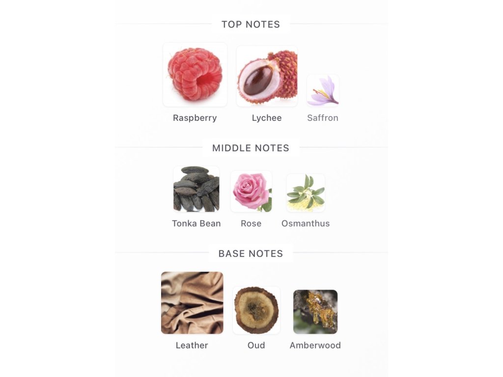 Svieža liči a malina zachytávajú sladkosť života, zatiaľ čo šafran dodáva červený nádych. V srdci znovu rozkvitajú osmanthus a ruža, ktorých bohatosť prehlbujú tonka bôby. Základ tvorí hlboké objatie kože, oudu a ambrových drevín, ktoré evokujú nekonečný plynutie času, kde konce sú len začiatkami.