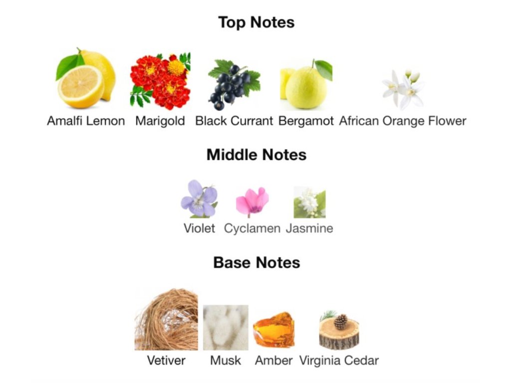 Najprv sa rozvonia aksamietnica, sladko citrusový bergamot a exotická aróma éterického oleja buchu. Po chvíli sa pripoja kvetinové tóny fialky a cyklámenu so živým vyznením. Základné tóny sa rozvíjajú najneskôr a patria marockému cédrovému drevu a vetiveru.