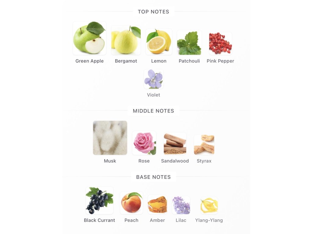 - v základe ambra, čierna ríbezľa, broskyňa, ylang-ylang a orgován,