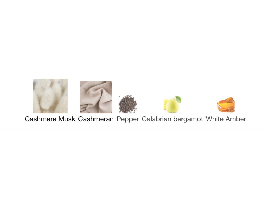 Parfum s tónmi kašmíru, bergamotu, ružového korenia, kašmírového dreva a bielej ambry.