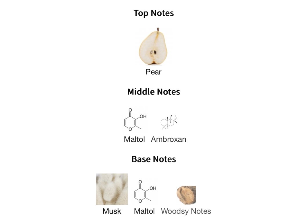 Žiarivá a zmyselná vôňa Kun Amo, v ktorej hrá hlavnú rolu hruška. Toto lahodné, slnkom zaliate, šťavnaté a zvodné ovocie sa tu prelína s bohatou dávkou sladkosti a podmanivých tónov, ktoré sú podložené moderným ambrovým drevom a ikonickým pižomom typickým.