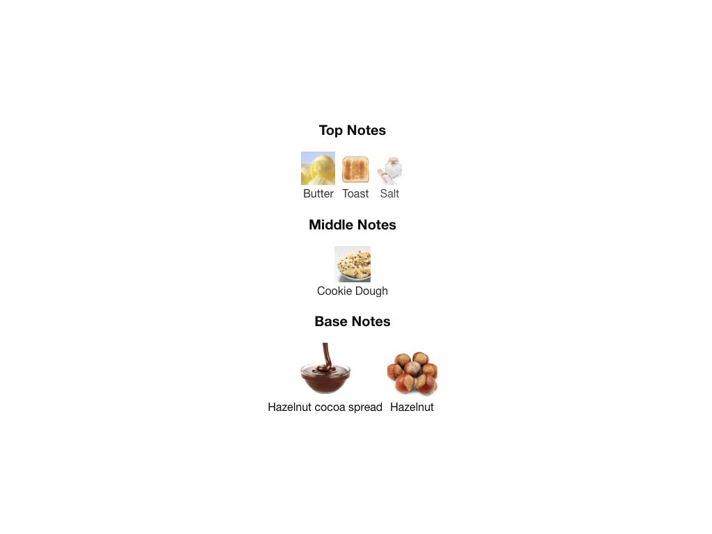 Čokoládová nátierka, sekané lieskové orechy Na dokončenie čuchovej cesty Le Gourmand odhaľuje svoju základnú notu, ktorá obsahuje luxusnú kombináciu čokoládovej nátierky a sekaných lieskových orechov. Táto nota evokuje nebeskú vôňu zamatovej, orieškovej čokoládovej nátierky, ktorá bola štedro natretá na čerstvo upečený bochník. Upokojujúce teplo a bohatosť tejto základnej noty zostane na vašej pokožke a zanechá nezabudnuteľnú a lákavú stopu.