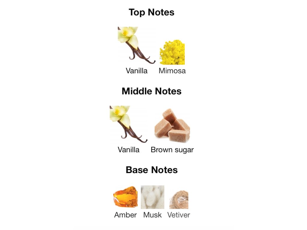 Spočiatku samozrejme vanilka, ale nečakaná vanilka, jemná, vzdušná, s jedinečným tónom ľahko medovej a práškovej mimózy. Pokračovaním je gurmánska vanilka, ale nie opojná, ovocná, vznáša sa medzi „skutočnou“ vanilkovou zmrzlinou a sladkými prísľubmi s ozvenou mdlých bozkov. Jednoznačné prebudenie, pojaté ako volanie, vzbudzujúce chuť do jedla, stavia svojho nositeľa do centra pozornosti.