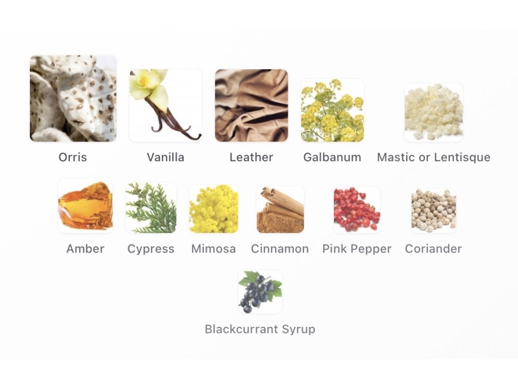 ambra, galbanum, kosatec, koža, rečík lentišek, vanilka