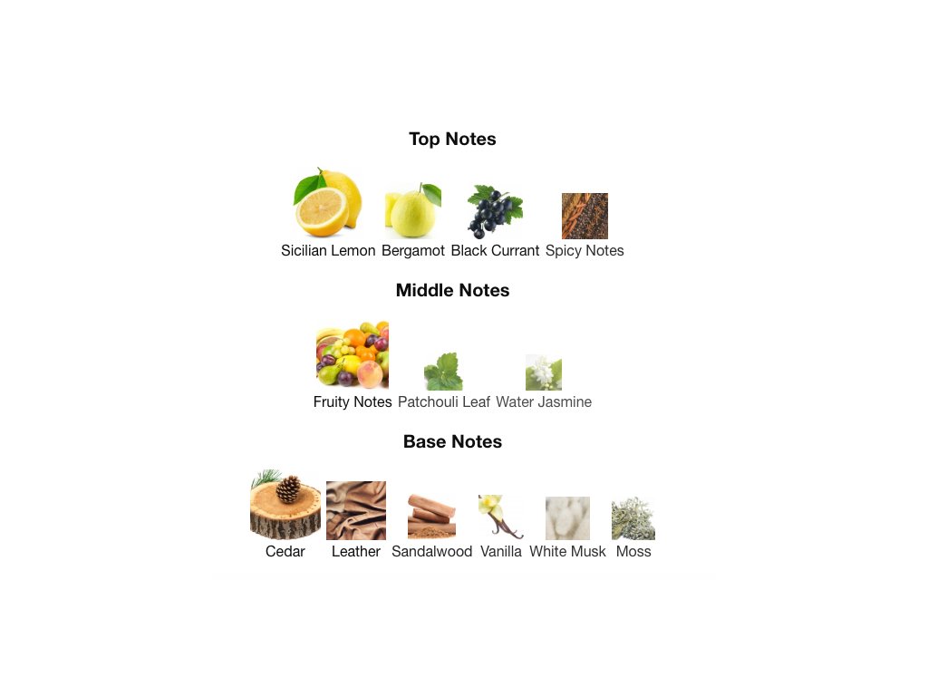 V úvode vône vás očarí explózia sviežosti vďaka kombinácii sicílskeho citróna, šťavnatých čiernych ríbezlí, sviežeho bergamotu a jemných korenistých tónov. Táto iskrivá a citrusová zmes je dokonalým začiatkom, ktorý pôsobí energicky a povzbudzujúco.