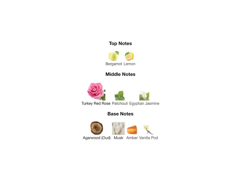 Základné tóny tvoria agarové drevo (oud), pižmo, ambra a vanilkový struk. Tento základ dodáva vôni hrejivý, zmyselný a dlhotrvajúci záver, v ktorom sa spája sladkosť vanilky s tajomnosťou oudu a jemnou zemitosťou pižma.