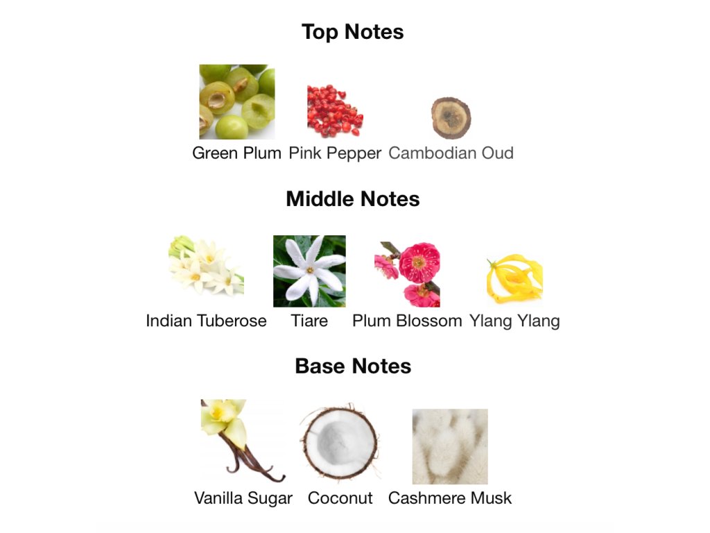 Telesný šepot prísľubu a provokácie: buď mojou slivkou, mojím zakázaným ovocím. Šťavnatá slivka sa trblieta ružovým korením, biele kvety kĺžu po pokožke, zatiaľ čo kokos, vanilka a jemný náznak oudu sa rozplývajú v zamatovom pižme a vytvárajú nezabudnuteľné objatie.