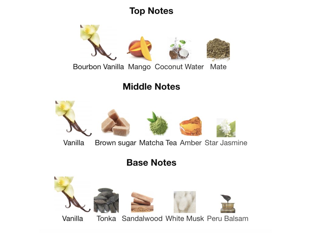 Úvod prepukne žiarivou fúziou mangovej šťavy, kokosovej vody a absolutu zeleného maté, ktorá evokuje tropický východ slnka – živý, šťavnatý a svieži. Ako sa vôňa usadzuje, objavuje sa absolut madagaskarskej vanilky a hnedý cukor, ktoré zahaľujú kompozíciu do krémovej, zlatistej sladkosti pripomínajúcej teplý dezert. Nádychy matchy a absolutu hviezdicového jazmínu dodávajú aromatickú sofistikovanosť a zabraňujú tomu, aby sladkosť prerástla do prílišnej sily. V závere čierna vanilka, krémové santalové drevo, biele pižmo a peruánsky balzam vytvárajú hladké, obklopujúce teplo a zanechávajú návykovú, zamatovú stopu.