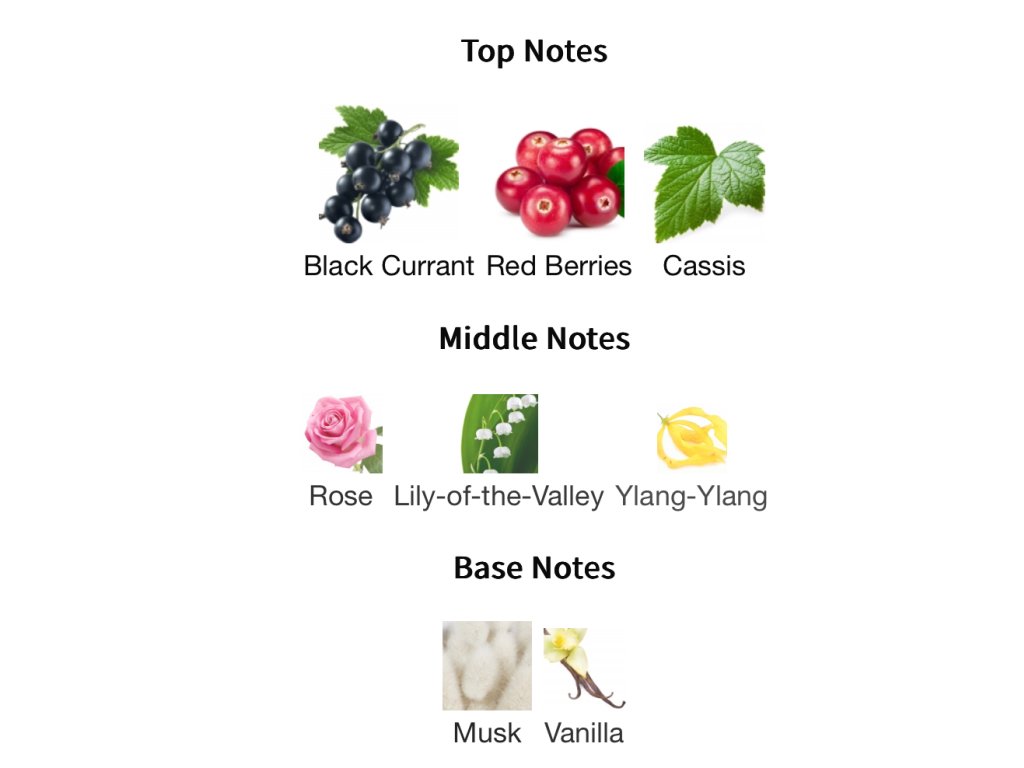 Pocit štěstí a dobrou náladu získáte díky šťavnatým brusinkám v kombinaci s vanilkou. Růže a tropický květ ylang ylang přinášejí hřejivé sluneční světlo do kontrastu s chladivě zelenými listy černého rybízu a květy konvalinek. Bílé pižmo v základu nenápadně splývá s pokožkou a dává vůni smyslnou hloubku.