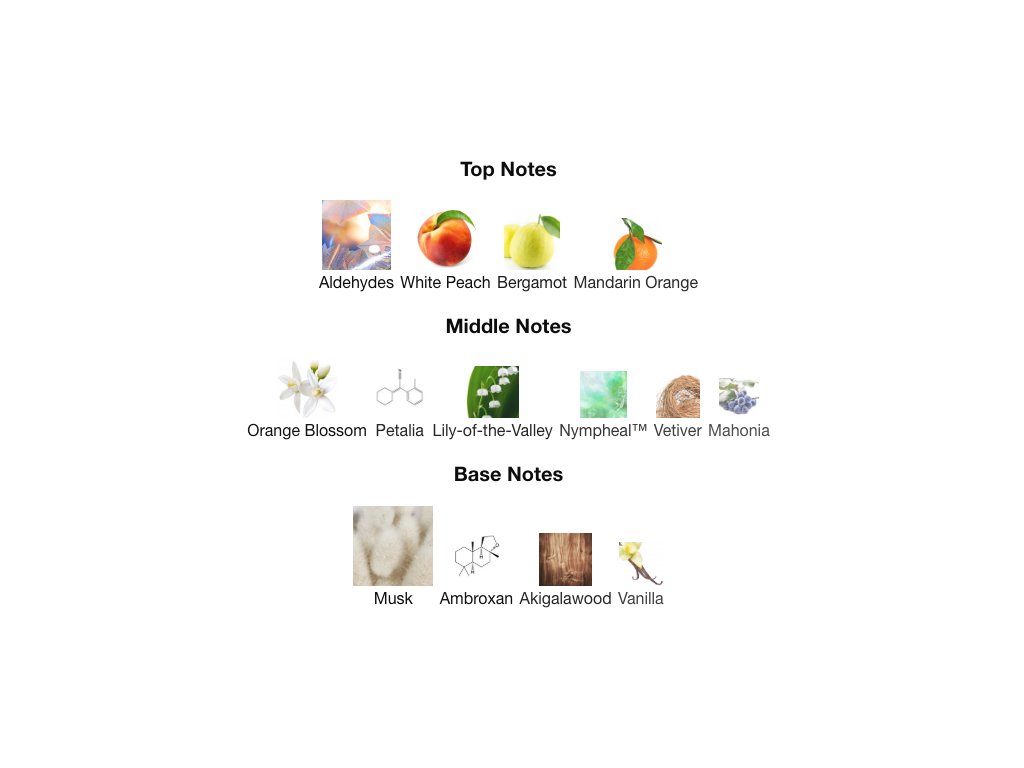 Najprv sa stretáva bergamot s mandarínkou a jemnou bielou broskyňou. Následne vás zaplavia kvety pomarančovníka a tóny konvalinky v podobe Nympheal™ s krémovým a mierne vodovým výsledkom, ku ktorým sa pridáva Mahonial®, ktorý pripomína sviežosť bielych kvetov a podporuje výdrž vône. V závere sa prebúdzajú tóny ambry prostredníctvom Ambrofix™, Akigalawood™ s tónmi korenia, pačuli a agarového dreva a tajomného korenia kompozície – pižma, ktoré zvyšuje jej zmyselnosť.