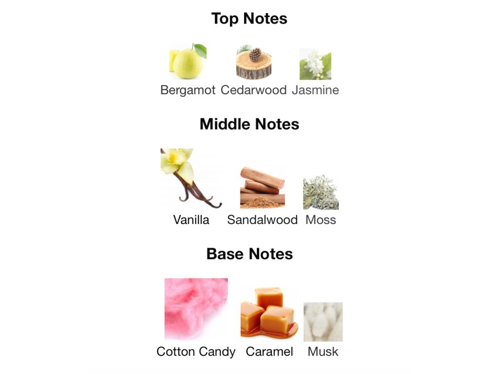 Úvod je živá a povzbudzujúca zmes bergamotu, jazmínu a cédrového dreva, zatiaľ čo srdce odhaľuje krémovú a drevitú fúziu vanilky, santalového dreva a machu. Základ tvorí sladká a zhovievavá zmes cukrovej vaty, karamelu a pižma, ktorá zanecháva podmanivý a dlhotrvajúci dojem.