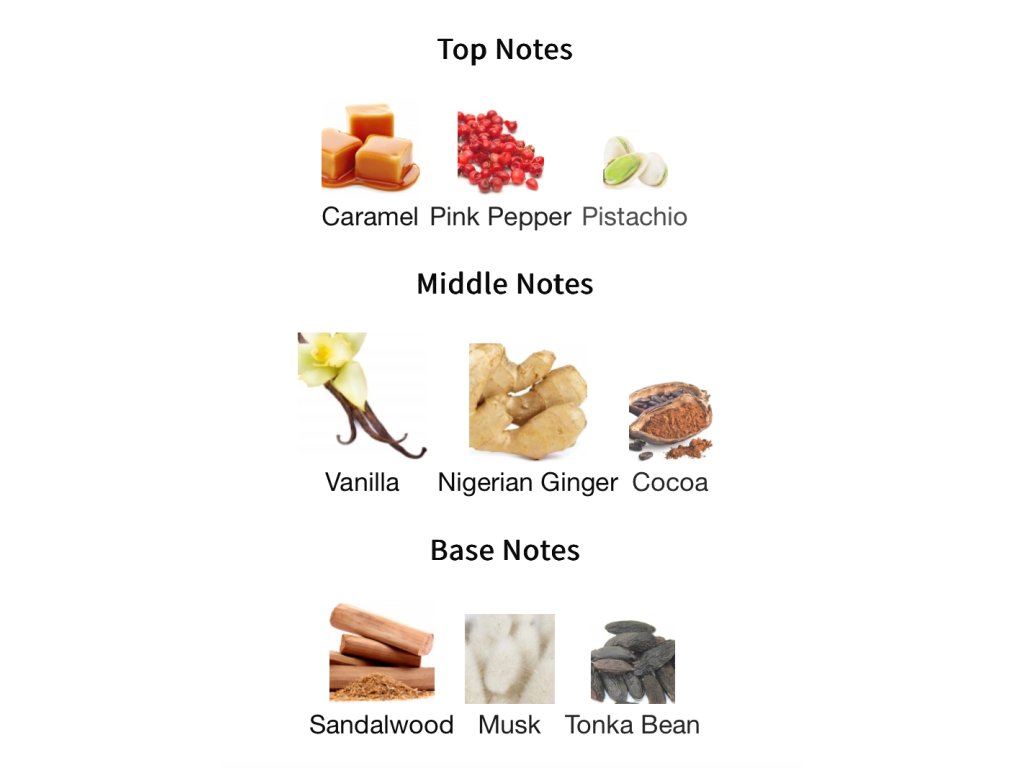 Táto lahodná teplá vôňa s korenistým nádychom sa časom rozvíja a vydrží až 12 hodín. Karamel a pistácie prechádzajú do bohatej vanilky a korenistého zázvoru, ktoré v základe dopĺňa zemité santalové drevo. V kombinácii s parfumovanými balzamami Rare na vrstvenie si môžete vytvoriť svoj vlastný jedinečný štýl.