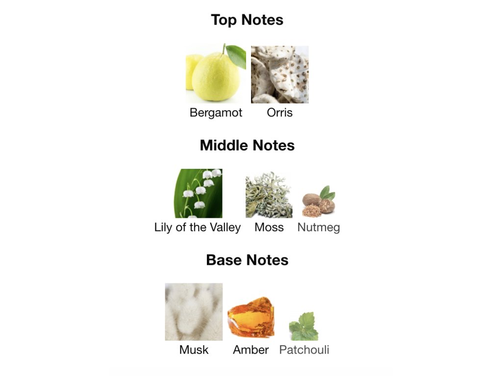 Ako sa presúva do srdca, rozvinie sa jemná harmónia muškátového orieška, machu a cibuľky – textúrovaná, zelená a hlboko emotívna, odrážajúca dualitu nežnej ženskosti a vnútorného odhodlania. Základ sa usadzuje do teplej ambry, pižma a pačuli, ktoré zanechávajú stopu, ktorá je zároveň upokojujúca a nezabudnuteľná.