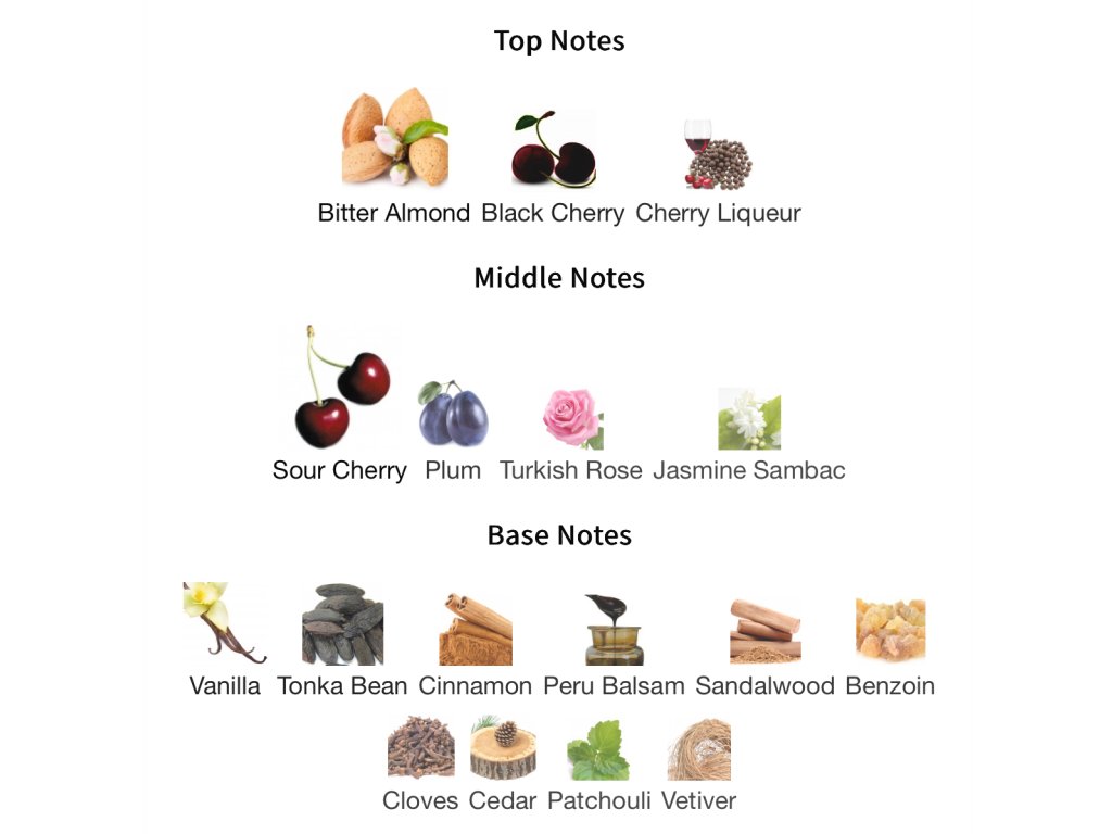 Vôňa sa otvára klasickou dokonalosťou čerešne – zrelá dužina tmavej čerešne, ponorená do čerešňového likéru s dotykom horkej mandle. Srdce bije v sladkých vlnách čerešňovej torty. prenikajú do vašej duše. Peruánsky balzam a pražená tonka fazule v základe naznačujú nové znázornenie ikonického symbolu.