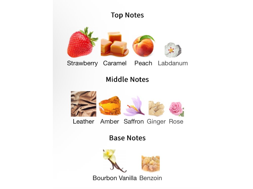 Vonnú kompozíciu otvára lahodná súhra sladkých jahôd, šťavnatej broskyne, krémového karamelu a intenzívneho labdana. Kožené srdce okúzľuje horkosladkým akcentom šafranu, s ktorým sa preťahuje o pozornosť hrejivá ambra, pikantný zázvor a nežná ruža. Zvodný základ tvorí vanilka spoločne s benzoe, ktorých sladko teplá aróma zahreje na duši.