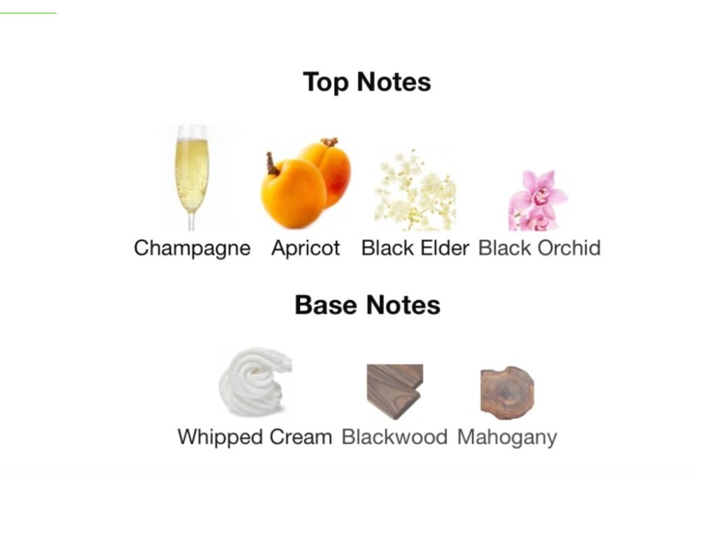 Vonnú kompozíciu otvárajú sladké tóny marhule a iskrivá esencia šumivého vína, ktorých živosť vyvažuje bylinná aróma čiernej bazy a omamná čierna orchidea. Potom sa už slova ujíma drevitý základ, ktorý sa skladá z pikantného mahagónu a zemitého indického palisandra a nad nimi sa vinie lahodný akcent šľahačky.